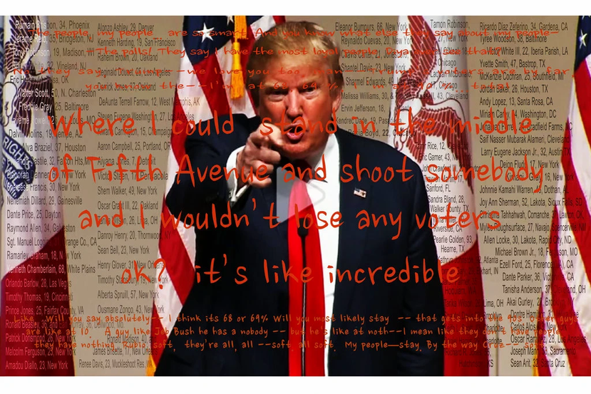 The first image is 'house beautiful:bringing the war home', which shows the Vietnam war during the 70s contrasting with an interior photo from Life Magazine. The war in Iraq motivated Martha Rosler to counterpose the reality of war with our consumer lifestyle, ' photo-op, 2004'. And the last piece is called 'point n'shoot', which contrasts with her other work because photoshop has been used. The background text are the list of names of people of colour who have been killed by the police in recent years, and the front text is a quote by Trump during the 2016 Republican primaries: "I could stand in the middle of Fifth Avenue and shoot somebody and I wouldn't lose any voters, OK?".